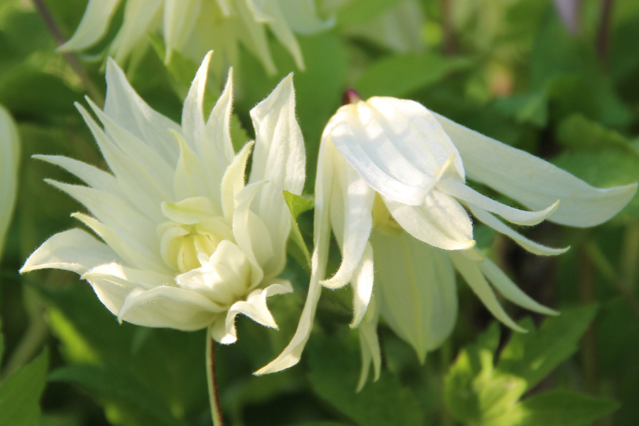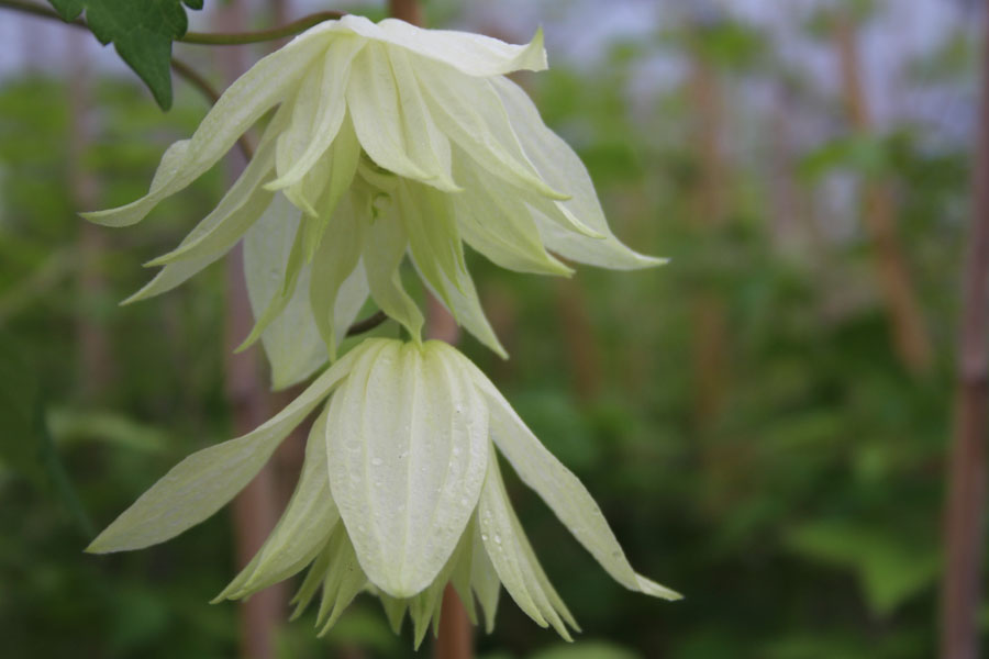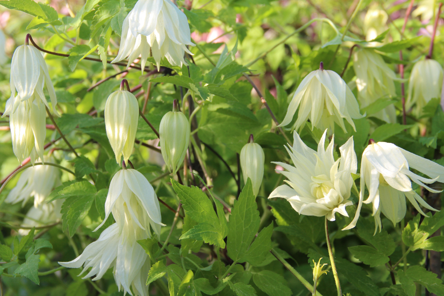 Hauptblütezeit der Clematis ist ab Ende April bis Mitte Mai. Jedoch blüht sie immer wieder im Sommer nach. Ihre cremegelben Blüten sind gefüllt und machen sowohl in Gehölzen, als auch an Gerüsten eine gute Figur.